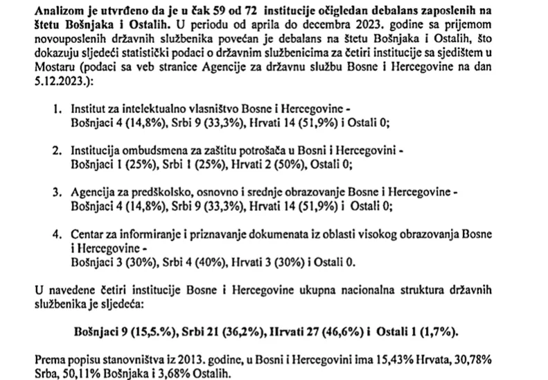Još jedna inicijativa odnosi se na obavezu četiri institucije Bosne i Hercegovine sa sjedištem u Mostaru da osiguraju odgovarajuću nacionalnu zastupljenost državnih službenika u skladu sa Zakonom o državnoj službi u institucijama Bosne i Hercegovine.