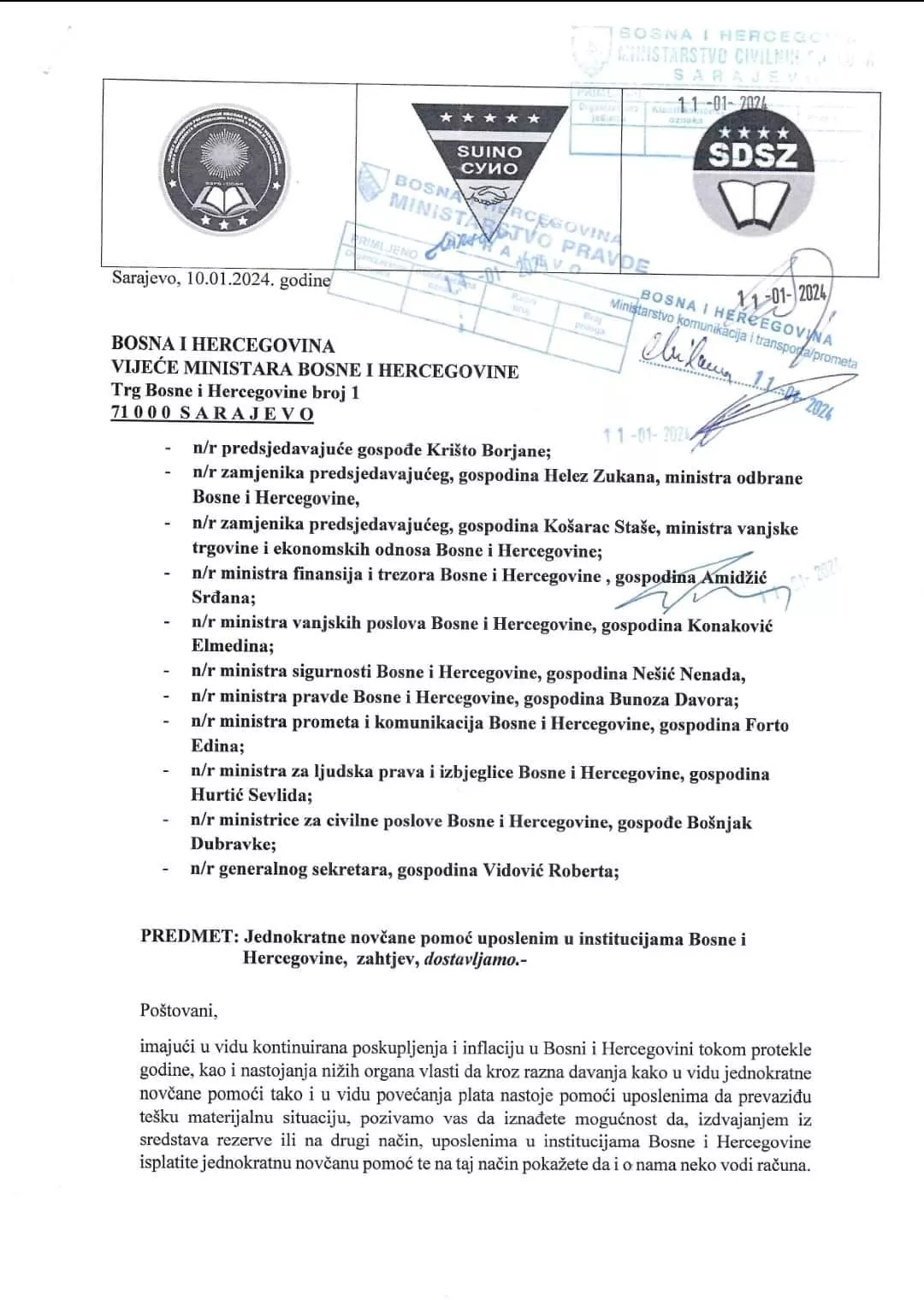 „Imajući u vidu kontinuirana poskupljenja i inflaciju u BiH tokom protekle godine, kao i nastojanja nižih organa vlasti da kroz razna davanja, kako u vidu jednokratne novčane pomoći tako i u vidu povećanja plata nastoje pomoći uposlenicima da prevaziđu tešku materijalnu situaciju, pozivamo vas da iznađete mogućnost da, izdvajanjem iz sredstava rezerve ili na drugi način, uposlenim u institucijama BiH isplatite jednokratnu novčanu pomoć te na taj način pokažete da i o nama neko vodi računa“, navodi se u dopisu.