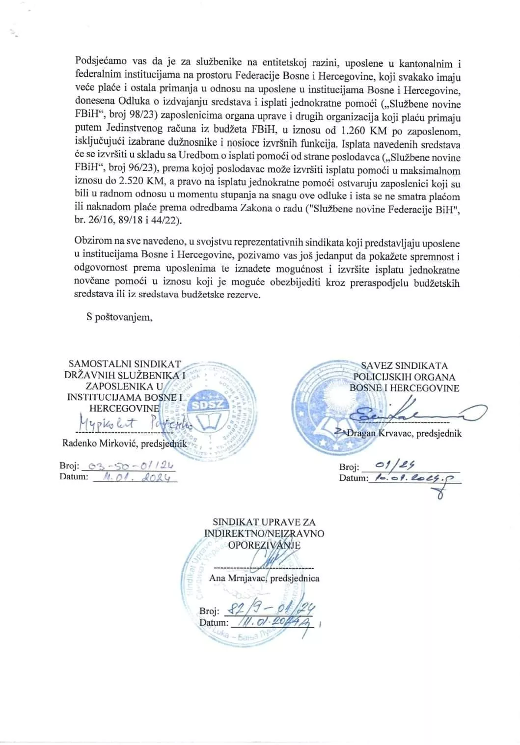 Sindikati podsjećaju državnu vlast da su na entitetskom nivou, pa i kantonalnim gdje su veće plaće i primanja u odnosu na uposlene u institucijama BiH, donesene odluke o izdvajanju sredstava i isplati jednokratne pomoći zaposlenicima organa uprave i drugih organizacija iz Budžeta FBiH u iznosu od 1.260 KM po zaposlenom isključujući izabrane dužnosnike i nosioce izvršnih funkcija.