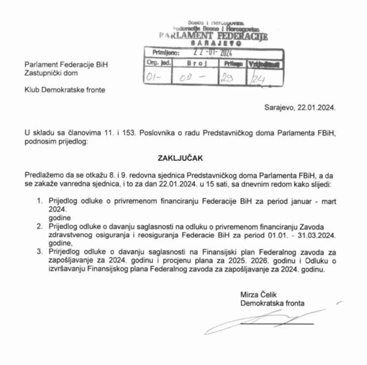 (Patria) - Mirza Čelik, zastupnik DF-a je u ime Kluba predložio zaključak na današnjoj sjednici Predstavničkog doma FBiH, koji glasi:
