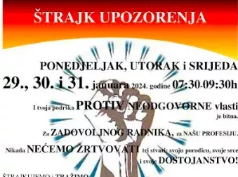 Dakle, štrajk upozorenja će se provesti u navedene dane i navedeno vrijeme u predškolskim ustanovama i ustanovama osnovnog odgoja i obrazovanja. Nadamo se da će naši zahtjevi biti ispunjeni do ponedjeljka, 29.1.2024. godine ili do okončanja štrajka upozorenja, 31.1.2024. godine, kako Sindikat ne bi imao razloga za provođenje sindikalnih mjera i aktivnosti kao što su protesti i generalni štrajk.