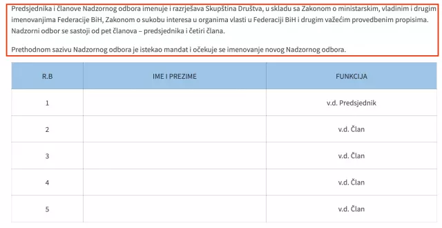 Ali od maja 2023. godine, do danas, februara 2024. godine, tabela u kojoj bi trebala pisati imena članova NO je prazna.