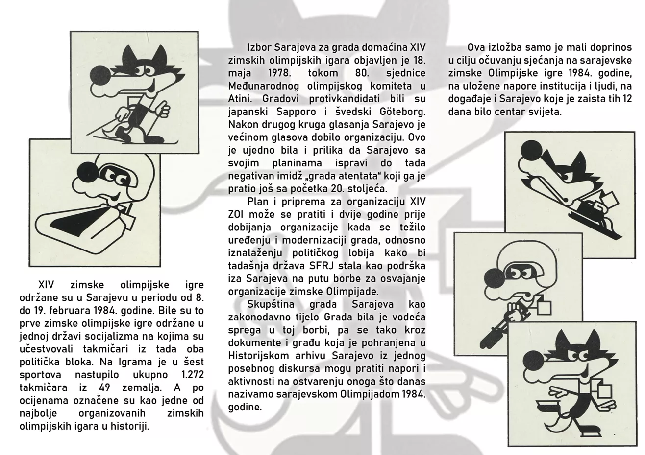 „XIV zimske olimpijske igre održane su u Sarajevu u periodu od 8. do 19. februara 1984. godine. Bile su to prve zimske olimpijske igre održane u jednoj državi socijalizma na kojima su učestvovali takmičari iz tada oba politička bloka. Na Igrama je u šest sportova nastupilo ukupno 1.272 takmičara iz 49 zemalja. A po ocjenama označene su kao jedne od najbolje organizovanih zimskih olimpijskih igara u historiji. Izbor Sarajeva za grada domaćina XIV zimskih olimpijskih igara objavljen je 18. maja 1978. tokom 80. sjednice Međunarodnog olimpijskog komiteta u Atini. Gradovi protivkandidati bili su japanski Sapporo i švedski Göteborg. Nakon drugog kruga glasanja Sarajevo je većinom glasova dobilo organizaciju. Ovo je ujedno bila i prilika da Sarajevo sa svojim planinama ispravi do tada negativan imidž „grada atentata“ koji ga je pratio još sa početka 20. stoljeća.