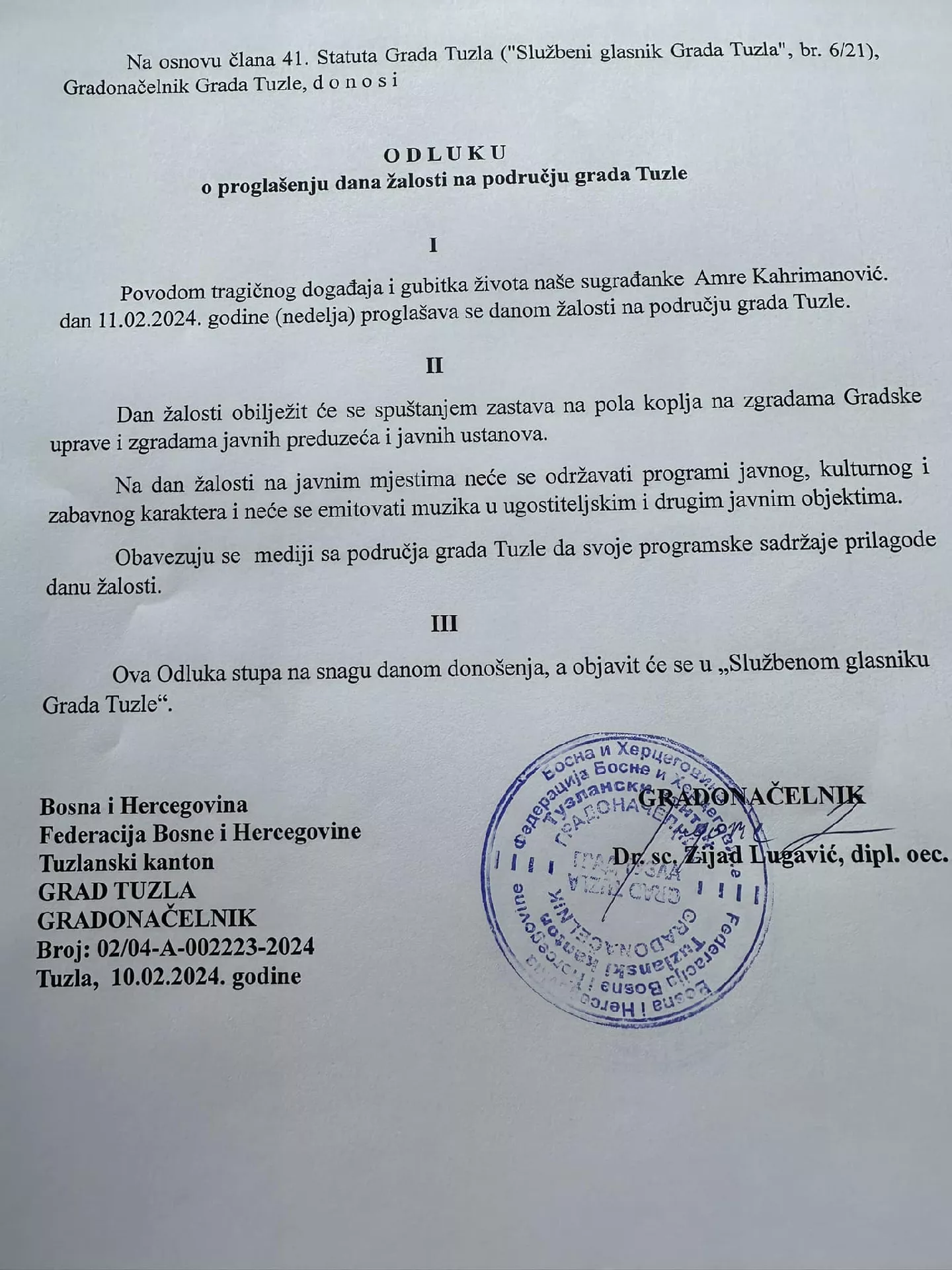 (Patria) - Gradonačelnik Zijad Lugavić donio je Odluku o proglašenju Dana žalosti na području Tuzle, povodom tragičnog događaja i gubitka života Tuzlanke Amre Kahrimanović.