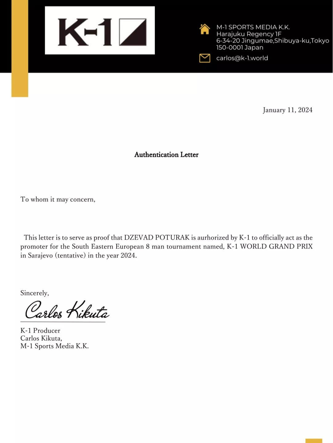 "Hvala ljudima iz Japana koji su prepoznali moj dugogodišnji rad u borilačkom sportu i dodijelili mi licencu da budem promotor borilačke scene", dodaje Poturak za NAP.
