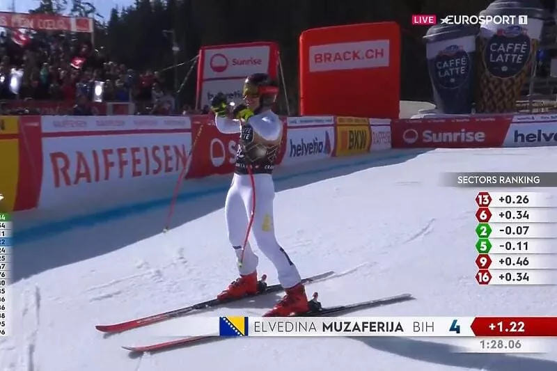 (Patria) - Najbolja bosanskohercegovačka skijašica Elvedina Muzaferija ostvarila je najbolji rezultat našeg skijanja u historiji Svjetskog kupa osvojivši u Crans Montani (Švicarska) četvrto mjesto u spustu. Za plasman na podij nedostajalo joj je samo 11 stotinki, a do uspjeha je stigla sa startnim brojem 28.