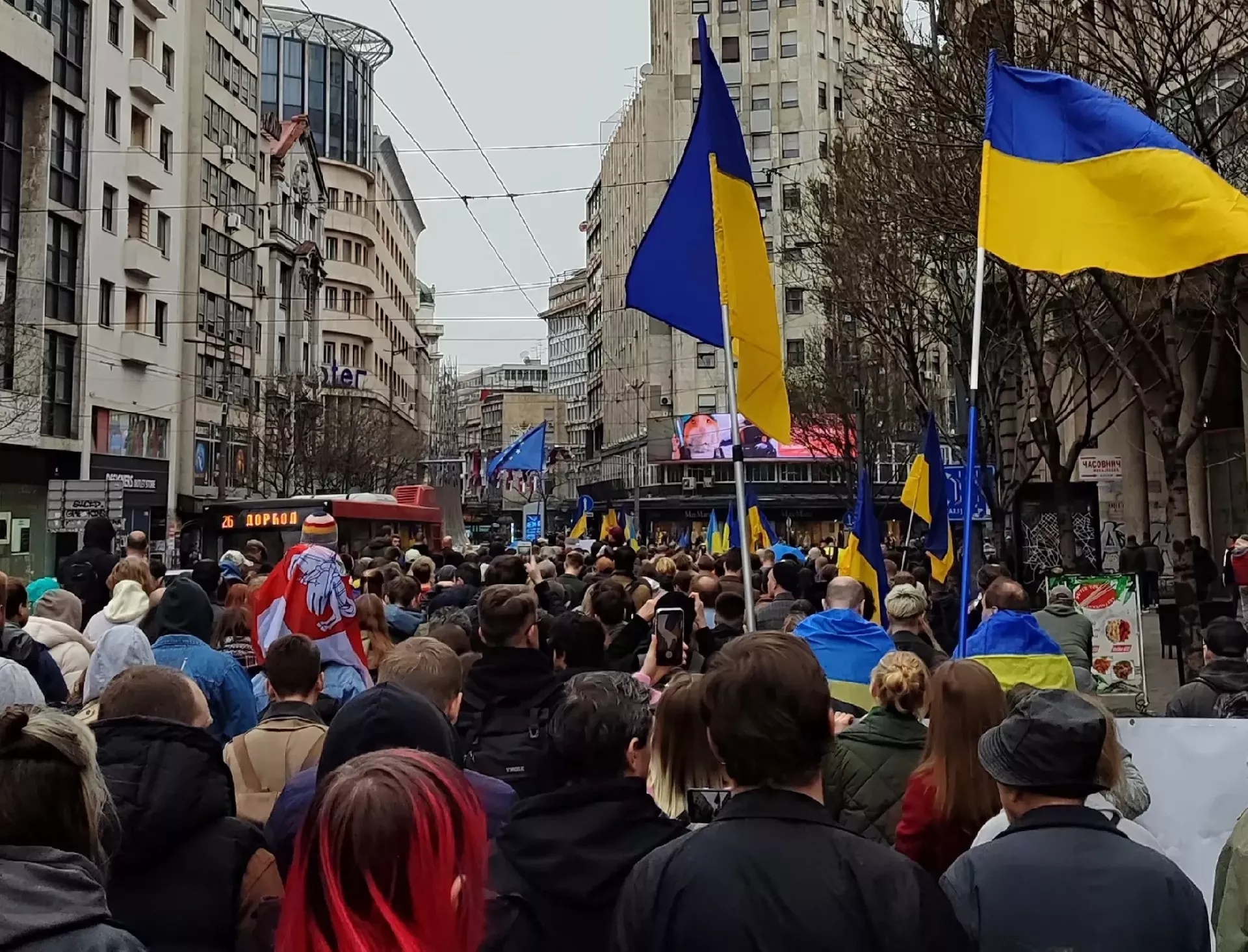 Građani su se okupili u Pionirskom parku u centru Beograda, odakle su prošetali do centralnog beogradskog Trga Republike. Na skupu je održana minuta šutnje za žrtve ruske agresije u Ukrajini.