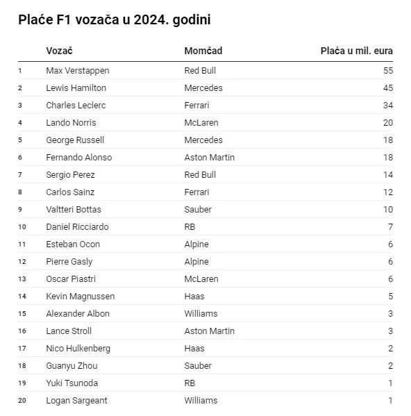 Konačno, napomenimo još nešto: riječ je o osnovnim platama koje ne uključuju bonuse za pobjede i postolja, rezultate timova ili nešto treće. S tim novcem neki će vozači zaraditi i znatno više.