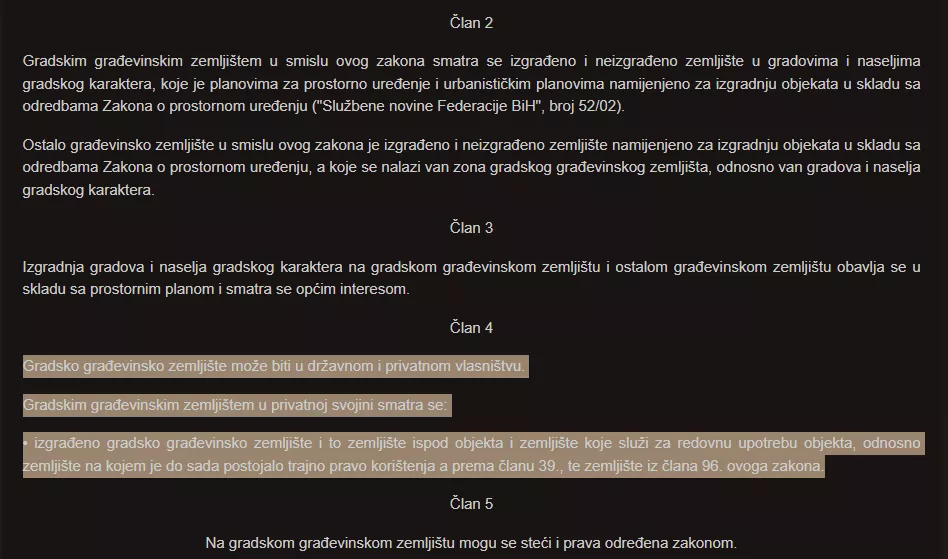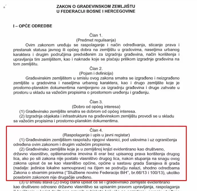 U članu 4. Prijedloga zakona kaže se: ”Gradevinskim zemljištem raspolažu njegovi vlasnici, pod uslovima i uz ograničenja određena ovim zakonom i drugim važećim propisima. (2) Građevinsko zemljište koje je u zemljišnoj knjizi evidentirano kao društveno, državno vlasništvo, opštenarodna imovina ili erar bez upisanog prava korištenja drugog lica, ako po sili zakona nije postalo vlasništvo drugog lica, nakon stupanja na snagu ovog zakona upisat će se kao vlasništvo općine, općine u sastavu grada Sarajeva ili grada (nadalje: jedinice lokalne samouprave) na čijem se području nalazi, shodno odredbama Zakona o stvarnim pravima ("Službene novine Federacije BiH", br.66/13 i 100/13), ukoliko posebnim zakonom nije drugačije uredeno”.