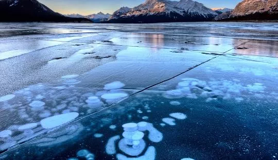 Ovo jezero, smješteno u pokrajini Alberta, poznato je po zamrznutim mjehurićima koji se vide ispod površine.