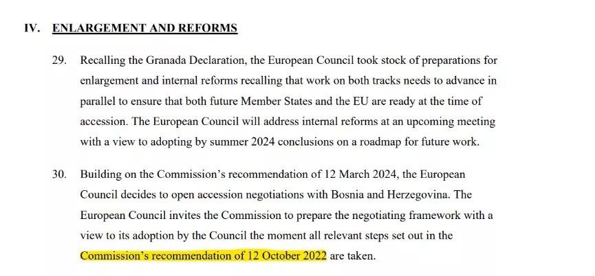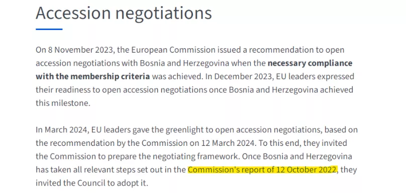 Drugo pitanje je same sadržine odluke. Na internet stranici Evropskog vijeća jasno piše da će se „Pregovarački okvir“ razmatrati onda kada se učine svi neophodni koraci iz Izvještaja Evropske komisije o Bosni i Hercegovini od 12. oktobra 2022. godine, što je i jedini dokument na taj datum. To jasno govori ova slika, koja govori o Izvještaju Evropske komisije (Commission's report) od 12. oktobra 2022. godine: