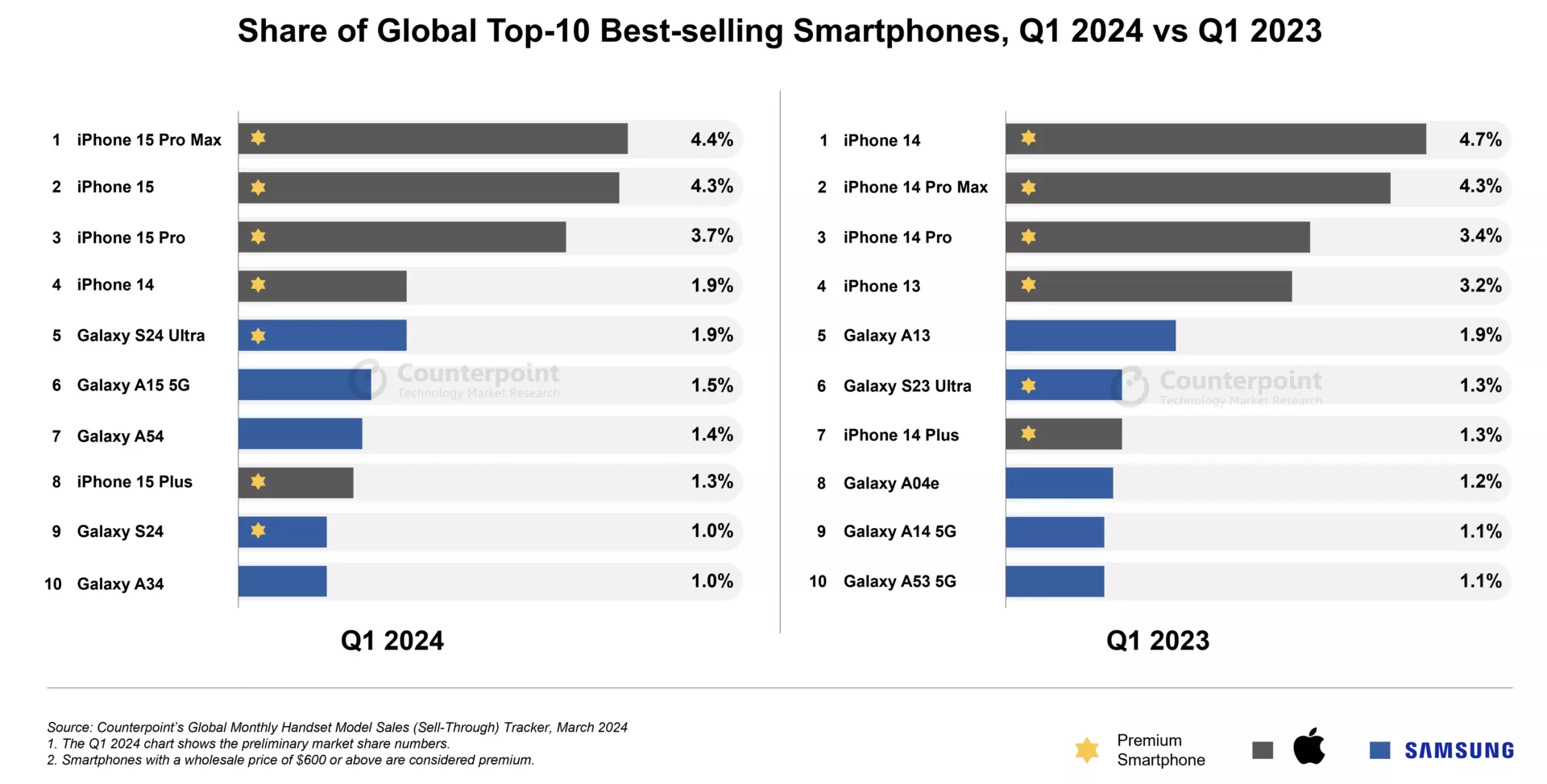 Counterpoint je najnovije istraživanje objavio na svojoj web stranici, a u njemu je prikazao deset najprodavanijih pametnih telefona u prvom kvartalu 2024., u poređenju s istim periodom prošle godine, prenosi Index.hr.