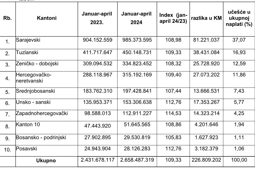 (Patria) - Porezna uprava Federacije BiH obavještava javnost da su porezni obveznici Federacije BiH u periodu januar-april 2024. godine uplatili 2.658.487.319 KM javnih prihoda, što je u odnosu na januar – april 2023. godine više za 226.809.202 KM, ili za 9,33 %. Uplate javnih prihoda u periodu januar-april 2024. godine u odnosu na januar-april 2023. godine po kantonima prikazujemo u sljedećoj tabeli: