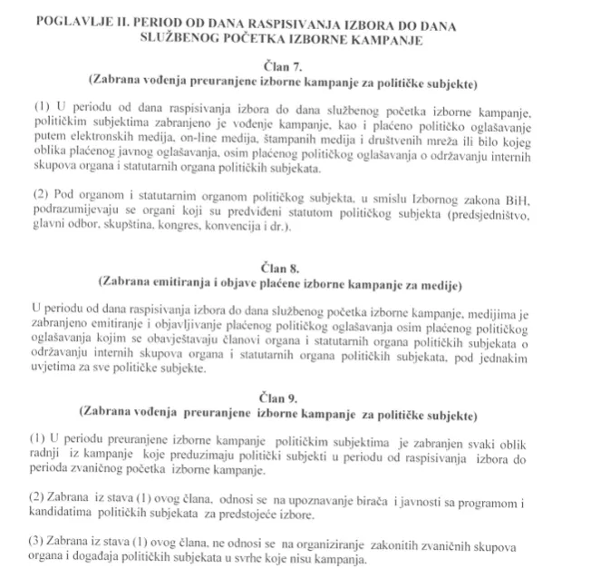 Kada je riječ o preuranjenoj kampanji CIK je jasno precizirao da je političkim subjektima zabranjeno vođenje kampanje kao i plaćeno političko oglašavanje putem medija ili društvenih mreža, osim oglašavanja o održanim internim skupovima organa i statutarnih organa političkih subjekata, a to su Predsjedništvo, Glavni odbor, Skupština, Kongres, Konvencija i dr. u periodu od dana raspisivanja izbora do dana zvaničnog početka izborne kampanje koja počinje 30 dana prije održavanja izbora.