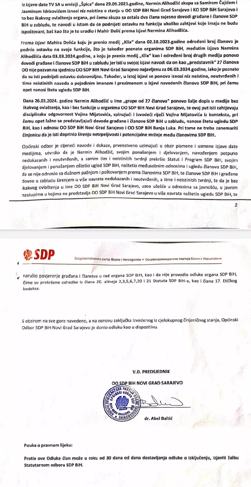 Također, grijeh Nermina Alihodžića je što je ispred ove grupe poslao dopis medijima kojim se traži disciplinska odgovornost Vojina Mijatovića, a čime „nanose štetu OO SDP Novi Grad i OO SDP Banja Luka“.
