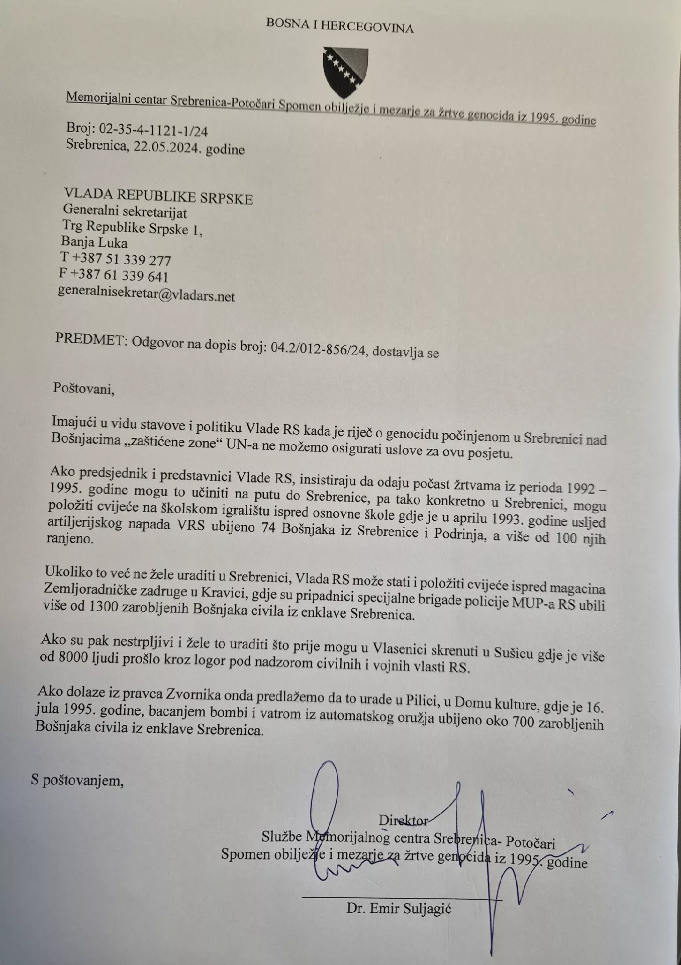 (Patria) - Direktor Memorijalnog centra Srebrenica - Potočari Emir Suljagić uputio je zvanični odgovor Vladi Republike srpske da ne mogu osigurati uslove za posjetu s obzirom na stavove i politiku Vlade Rs o genocidu počinjenom u Srebrenici nad Bošnjacima zaštićene zone UN-a.