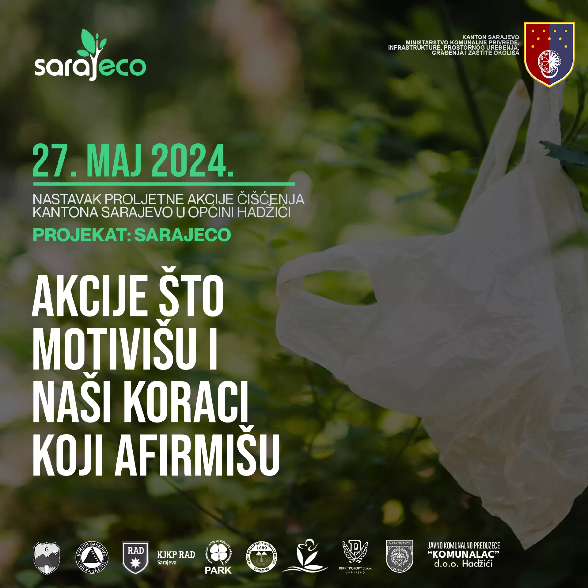 (Patria) - Akcija proljetnog čišćenja Kantona Sarajevo "Sarajeco" nastavlja se sutra, u ponedjeljak, 27. maja 2024. godine, na području općine Hadžići, saopćeno je iz Ministarstva komunalne privrede, infrastrukture, prostornog uređenja, građenja i zaštite okoliša Kantona Sarajevo.