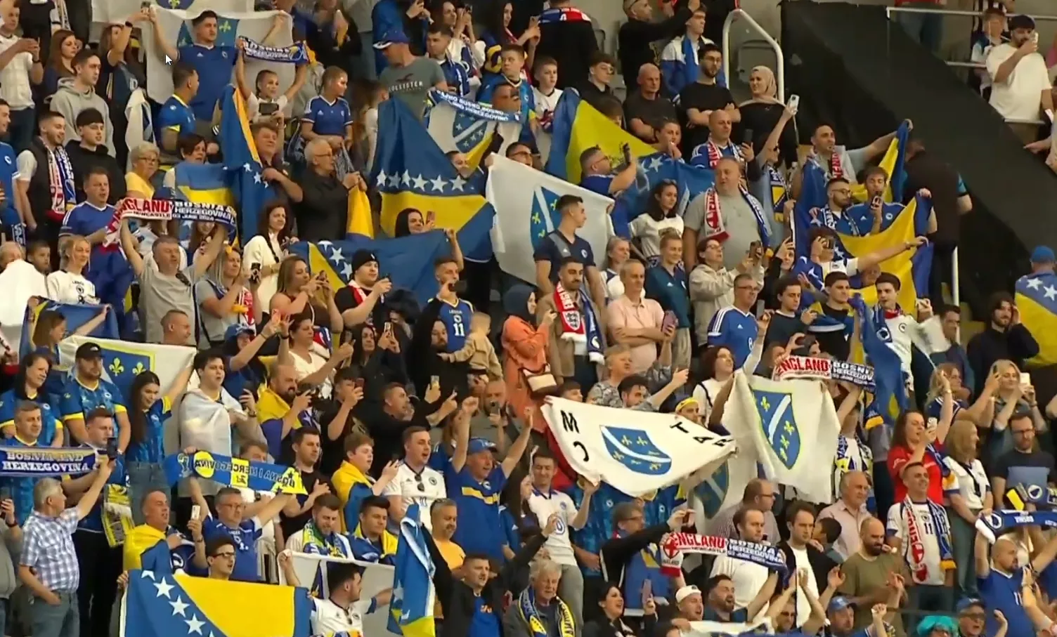 Na tribinama St James' Parka nalazi se nemali broj navijača Bosne i Hercegovine, a viore se zastave, kako aktuelne, tako i one Republike Bosne i Hercegovine.