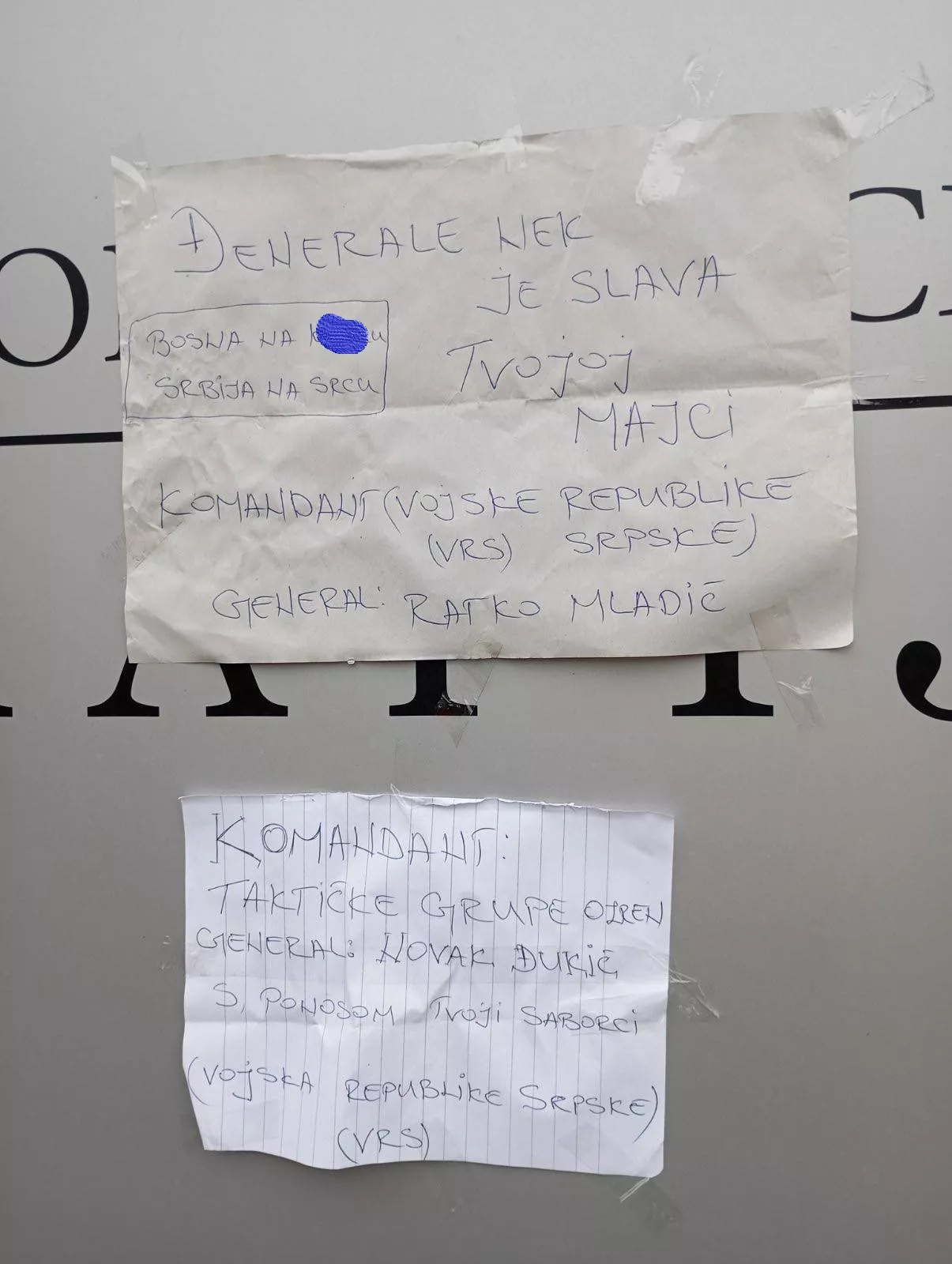 Na plakatima je pisalo "Đenerale nek’ je slava tvojoj majci - komandant Vojske Republike srpske general Ratko Mladić" i "Komandant Taktičke grupe Ozren general Novak Đukić - s ponosom, tvoji saborci".