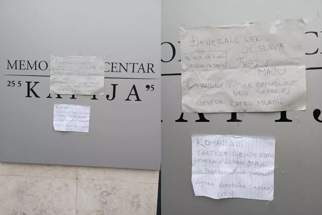 Zaposlenici u Memorijalnom centru "Kapija" dva dana nakon godišnjice ovog zločina na ulazu u zgradu zatekli su plakate s uvredljivim sadržajem.