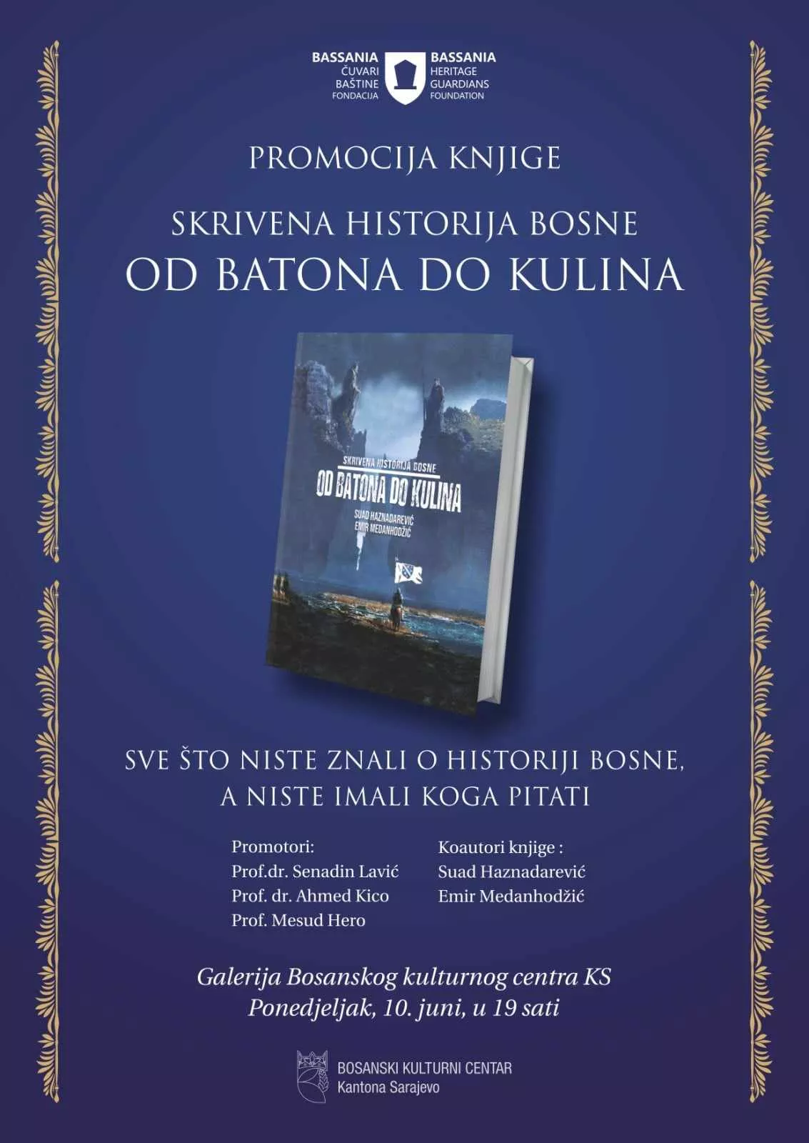(Patria) - Promocija knjige “Od Batona do Kulina” autora Suada Haznadarevića i Emira Medanhodžića u organizaciji Fondacije “Čuvari baštine – Bassania” i Bosanskog kulturnog centra Kantona Sarajevo, bit će održana u galeriji BKC-a, u ulici Branilaca Sarajeva br. 24, u ponedjeljak, 10. juna, u Sarajevu s početkom u 19 sati.