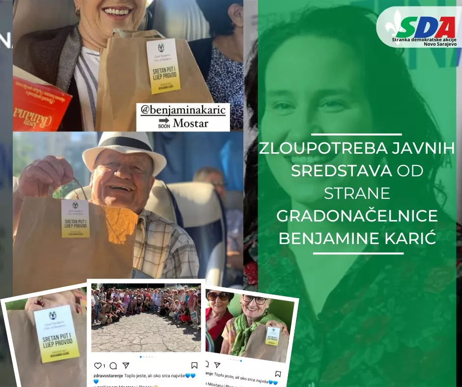 Naime, Gradonačelnica Karić, kandidatkinja SDP-a i Trojke, za načelnicu Općine Novo Sarajevo na predstojećim lokalnim izborima, javnim sredstavima organizovala je izlete za penzionere upravo iz općine Novo Sarajevo, a na samim izletima dijelila poklone penzionerima sa svojim potpisom.