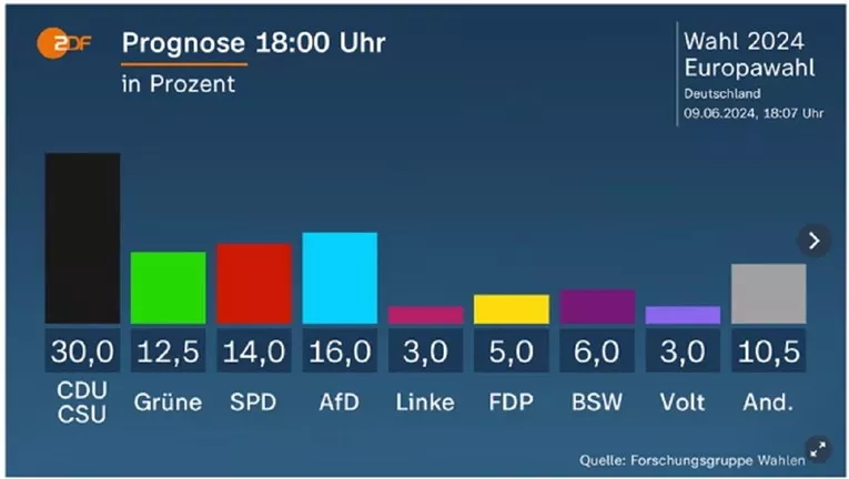 Što se tiče Njemačke, vodi CDU s 29.5 posto, a drugi je ekstremno-desni AfD sa 16.5 posto. Treći je SPD s 14%. Zeleni imaju 12 posto, a Slobodni demokrati 5 posto. Za usporedbu, AfD je 2019. imao 11 posto. Socijaldemokratska partija Njemačke kancelara Olafa Scholza zabilježila je historijski poraz.