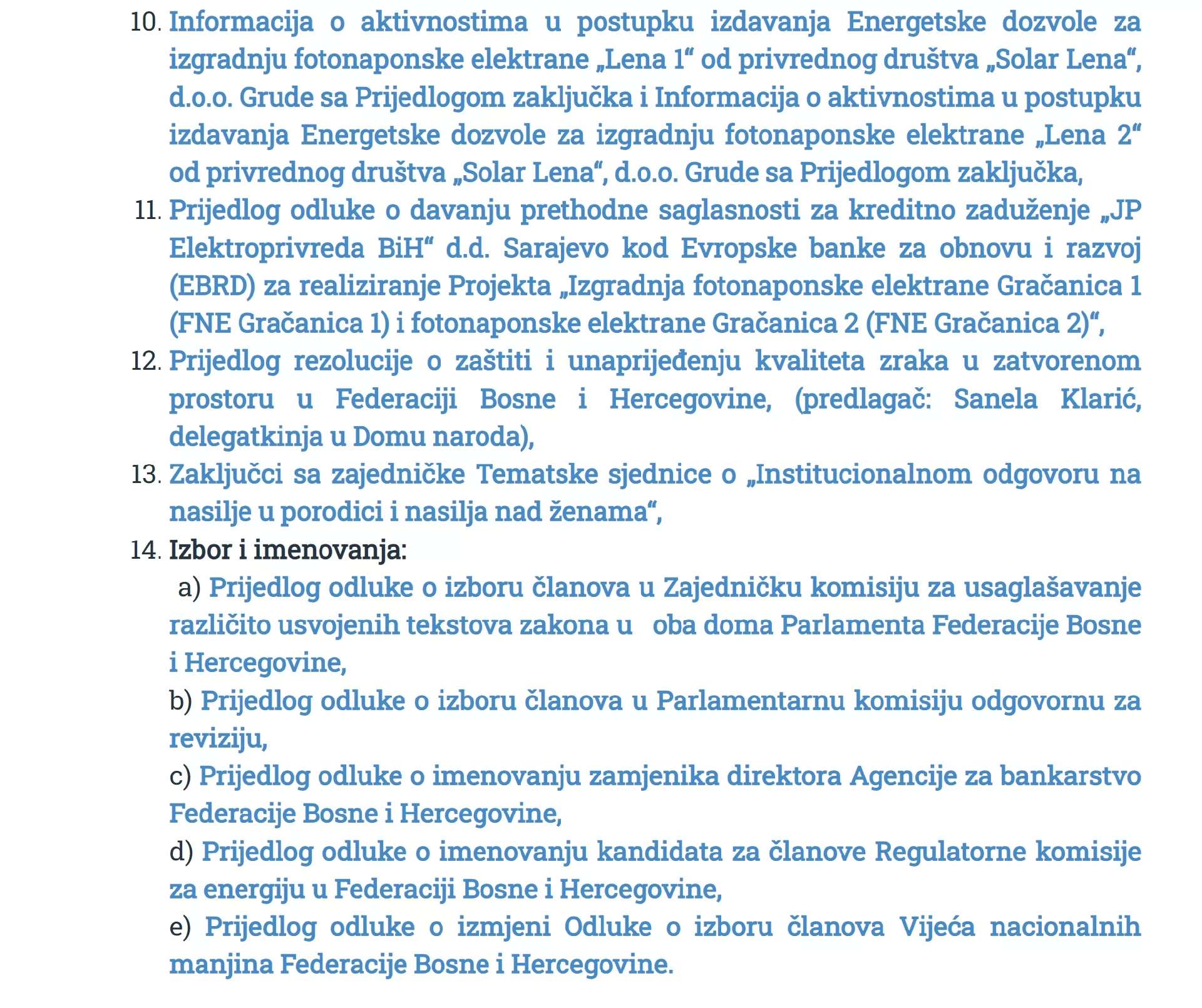 U okviru tačke izbori i imenovanja, delegati bi danas trebali glasati o donošenju odluke kojom bi na mandatni period od pet godina bili imenovani novi članovi Regulatorne komisije za energiju u FBiH (FERK), i to Samir Hadžihuseinović, Sanela Pokrajčić i Vesna Marić.