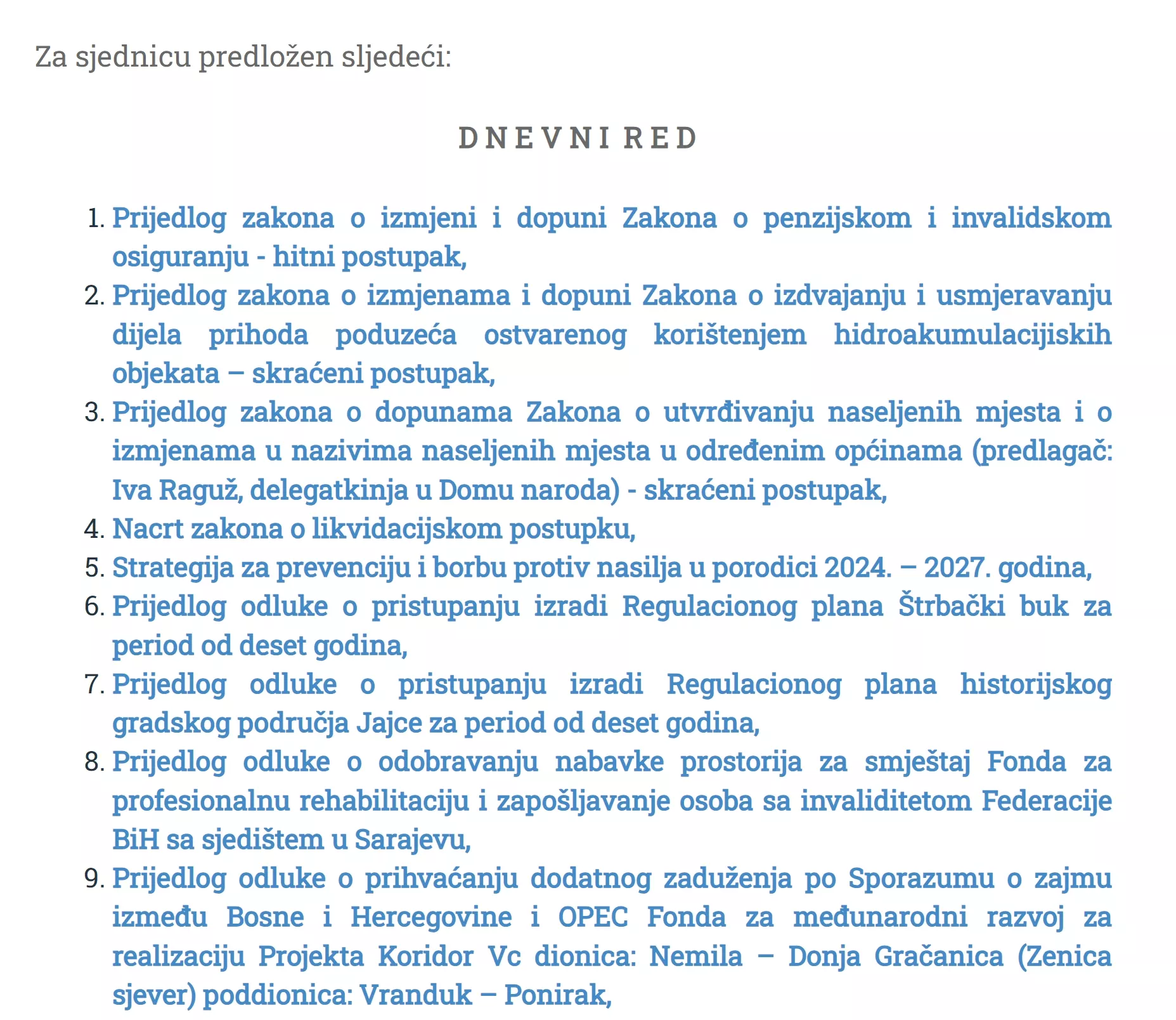Na dnevnom redu je i Strategija za prevenciju i borbu protiv nasilja u porodici za period 2024-2027., koju je već usvojio Zastupnički dom. Na taj će se način delegati izjasniti i žele li da Strategija postane krovni strateški dokument za jačanje institucionalnog odgovora na nasilje u porodici i nasilje nad ženama.