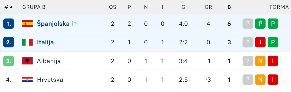 Španci nakon dva susreta imaju isto toliko pobjeda, odnosno šest bodova, i već su se plasirali u osminu finala. Italijani imaju 3, a Albanija i Hrvatska po 1.