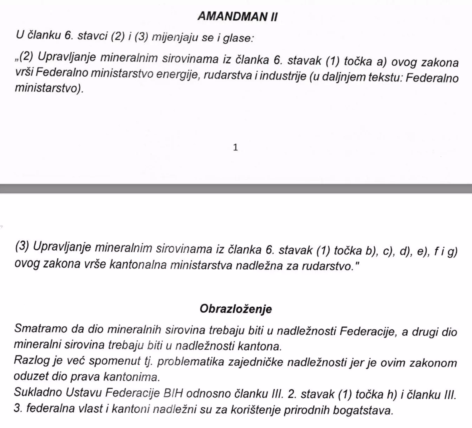 "Smatramo da dio mineralnih sirovina trebaju biti u nadležnosti Federacije, a drugi dio mineralnih sirovina trebaju biti u nadležnosti kantona. Razlog je već spomenut tj. problematika zajedničke nadležnosti jer je ovim zakonom oduzet dio prava kantonima", piše u obrazloženju HDZ-ovih amandmana.