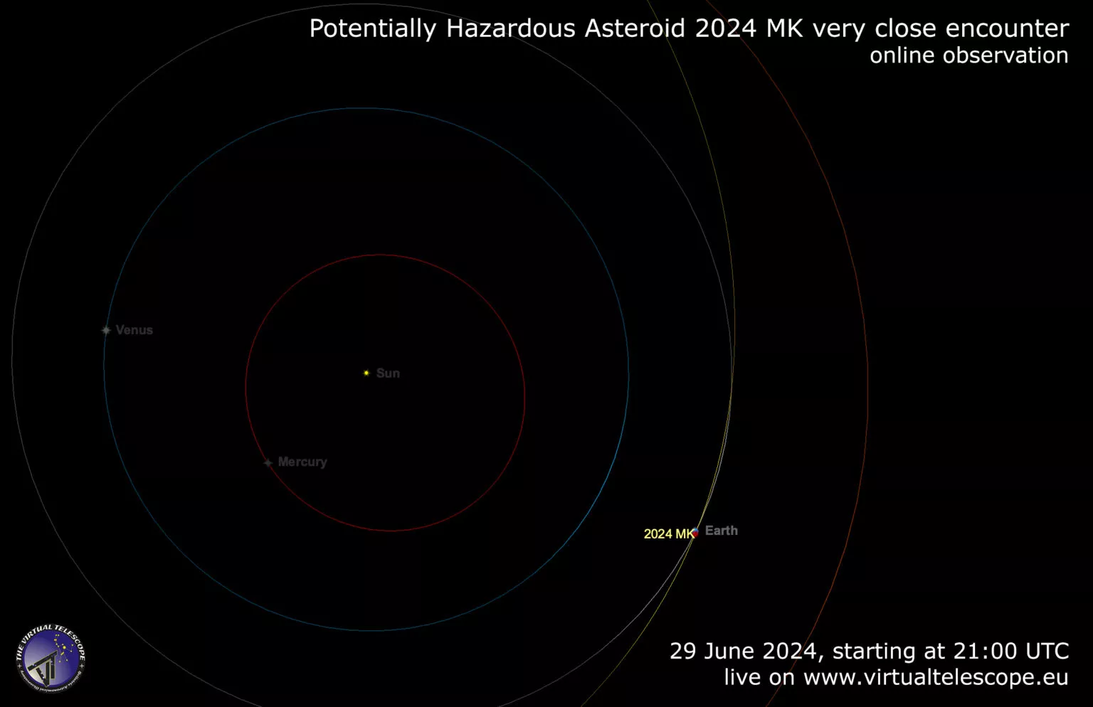 Kako piše Virtual Telescope Project, asteroid je otkriven 16. juna 2024., a proći će na udaljenosti od 295.000 km, što je oko 77% prosječne udaljenosti Mjeseca od Zemlje.