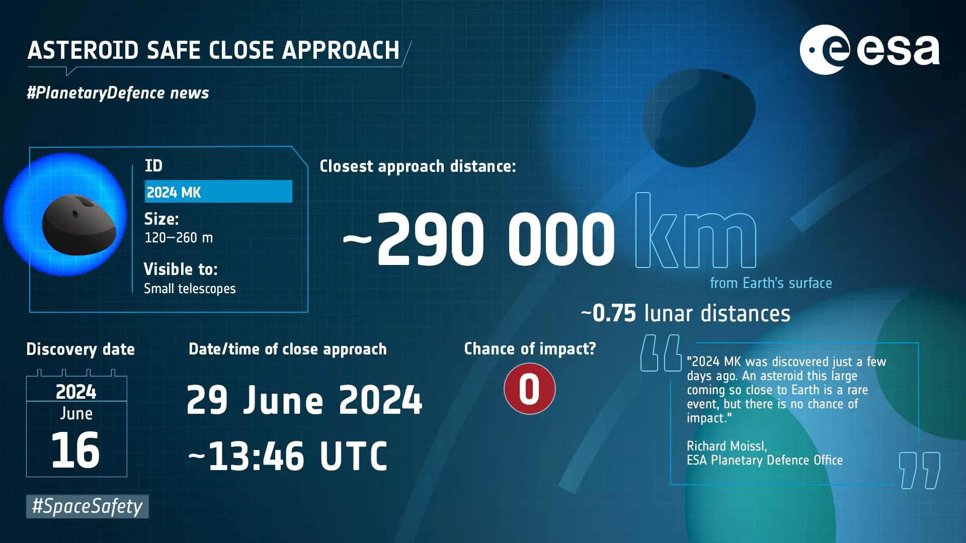 "Asteroid je otkriven 16. juna 2024., samo 13 dana prije nego će proći pored Zemlje. Ne predstavlja opasnost za našu planetu, ali činjenica da smo ga otkrili tek nedavno naglašava potrebu za poboljšanim sistemom otkrivanja potencijalno opasnih objekata", piše ESA.