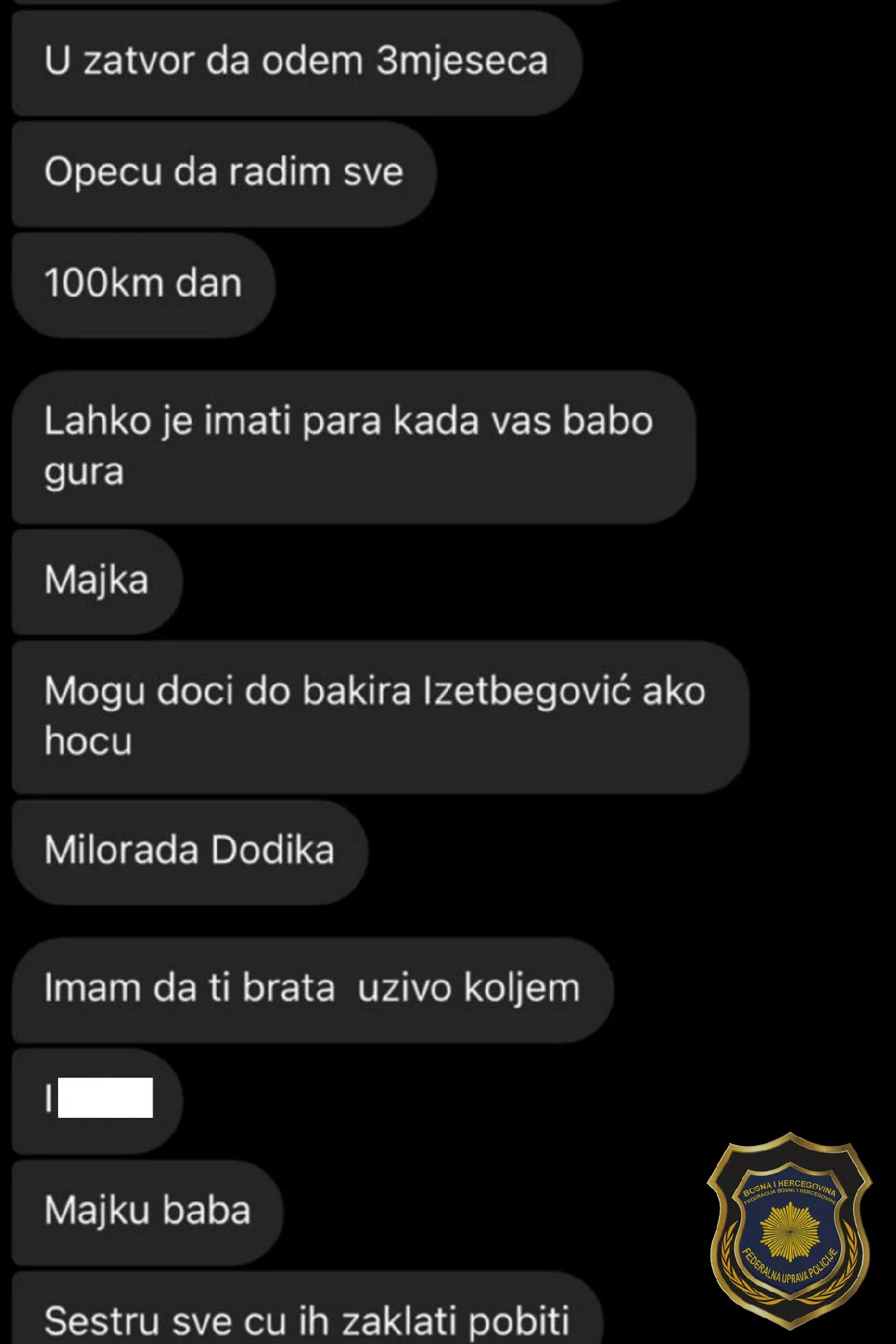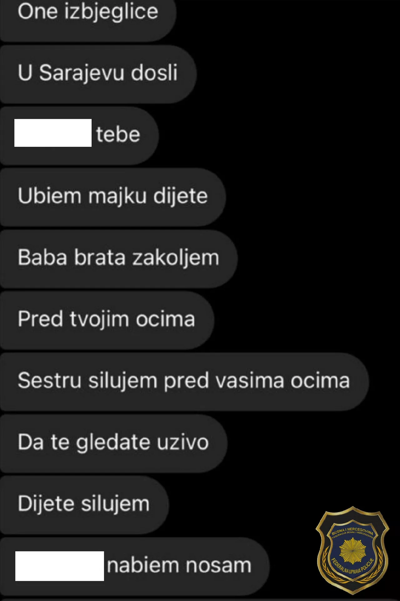 Osumnjičena osoba je s više desetina korisničkih računa na internetu, putem društvenih mreža, upućivala ozbiljne prijetnje po život i tijelo i sigurnost imovine oštećenih, navodeći da će iste lišiti života klanjem i bacanjem eksplozivnih naprava, da će izvršiti silovanje te upućivanjem drugih ozbiljnih prijetnji.