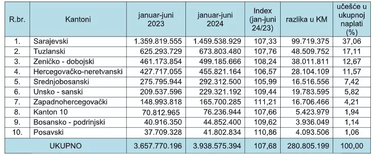 (Patria) - Porezna uprava Federacije BiH obavještava javnost da su porezni obveznici Federacije BiH u periodu januar – juni 2024. godine uplatili 3.938.575.394 KM javnih prihoda, što je u odnosu na januar – juni 2023. godine više za 280.805.199 KM, ili za 7,68%.