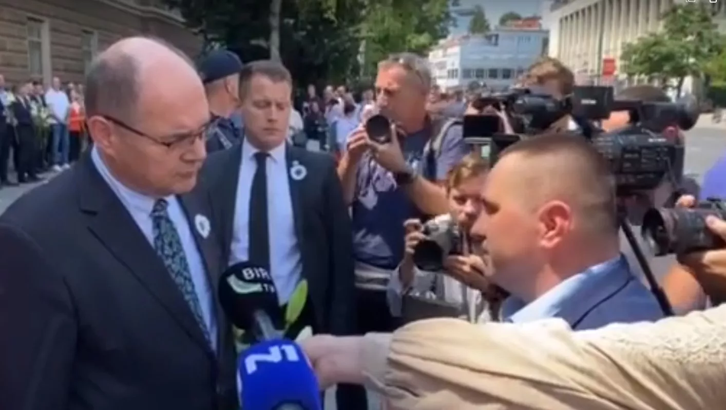 (Patria) - Preživjela žrtva genocida Adel Šabanović uoči ispraćaja kolone sa 14 identifikovanih žrtava genocida u Srebrenici, tražio je da razgovara sa visokim predstavnikom Christianom Schmidtom koji je stajao sa ostalim zvaničnicima ispred Predsjedništva BiH.