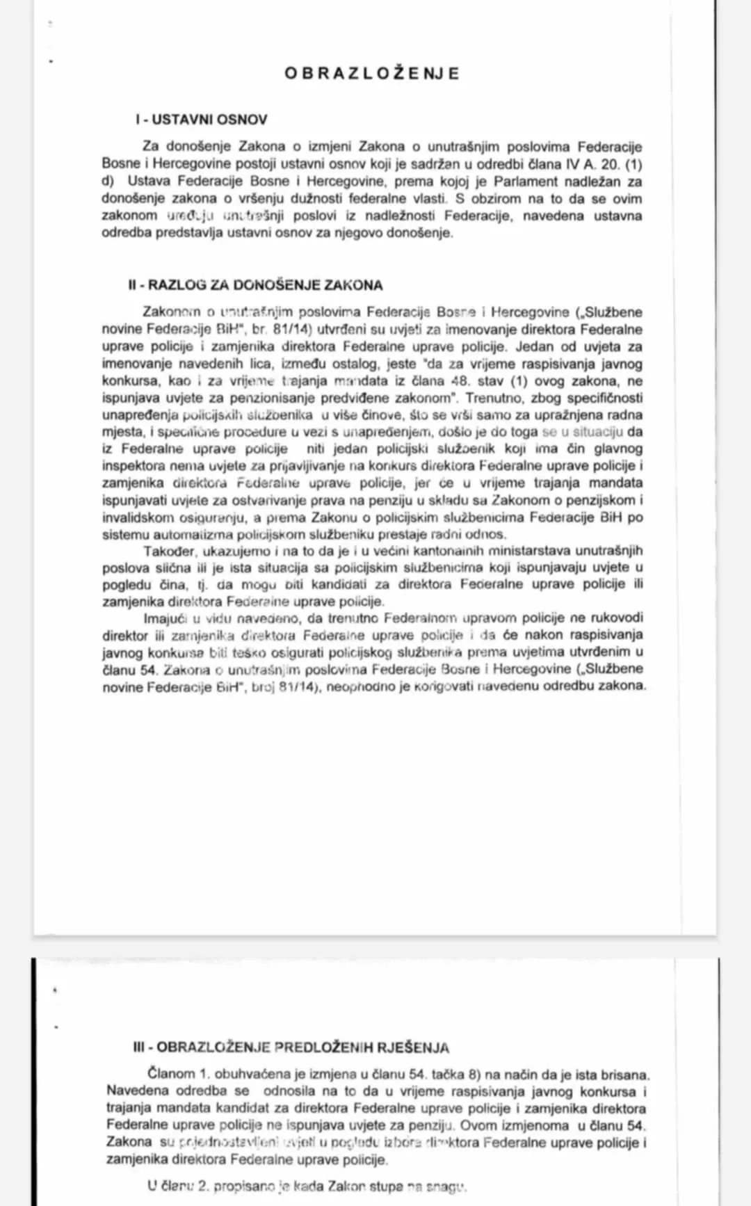 Kada je riječ o Zakonu o unutrašnjim poslovima FBiH, usvojenim izmjenama briše se odredba koja se odnosila na to da u vrijeme raspisivanja javnog konkursa i trajanja mandata kandidat za direktora i zamjenika direktora Federalne uprave policije ne ispunjava uslove za penziju.