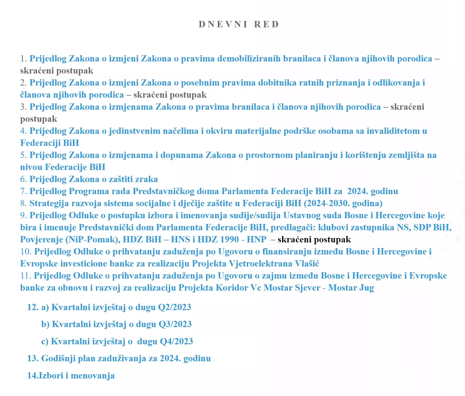 (Patria) - U Sarajevu će danas, sa početkom u 11 sati, zasjedati Zastupnički dom Parlamenta FBiH. Na predloženom dnevnom redu je ukupno 14 tačaka.