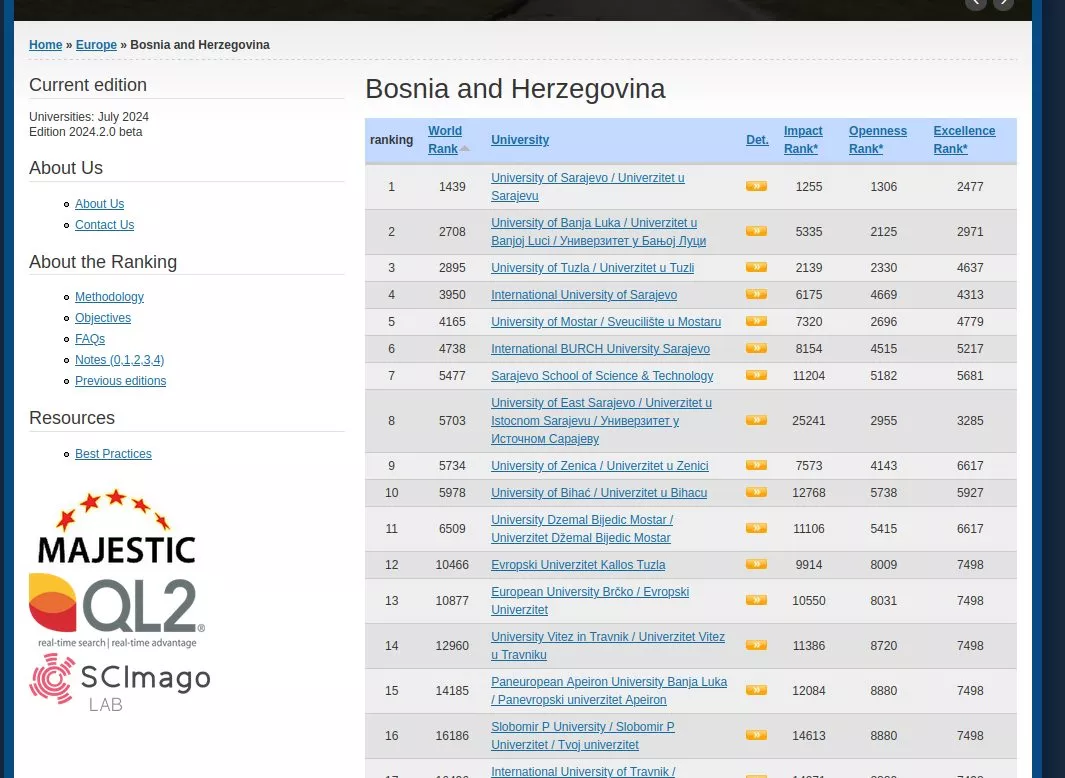 (Patria) - U julskom izdanju Webometricsovog rangiranja Univerzitet u Sarajevu se nalazi na 1439. mjestu na svjetskoj listi u poretku više od 32 hiljade univerziteta koji su obuhvaćeni skriningom po tri kriterija: utjecaj,