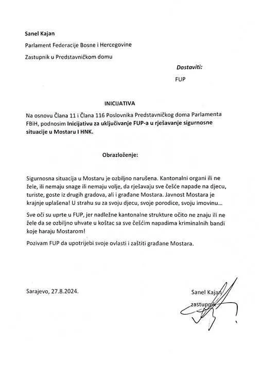(Patria) - Na osnovu Člana 11 i Člana 116 Poslovnika Predstavničkog doma Parlamenta FBiH, podnosim inicijativu za uključivanje FUP-a u rješavanje sigurnosne situacije u Mostaru i HNK, objavio je federalni zastupnik Demokratske fronte Sanel Kajan.