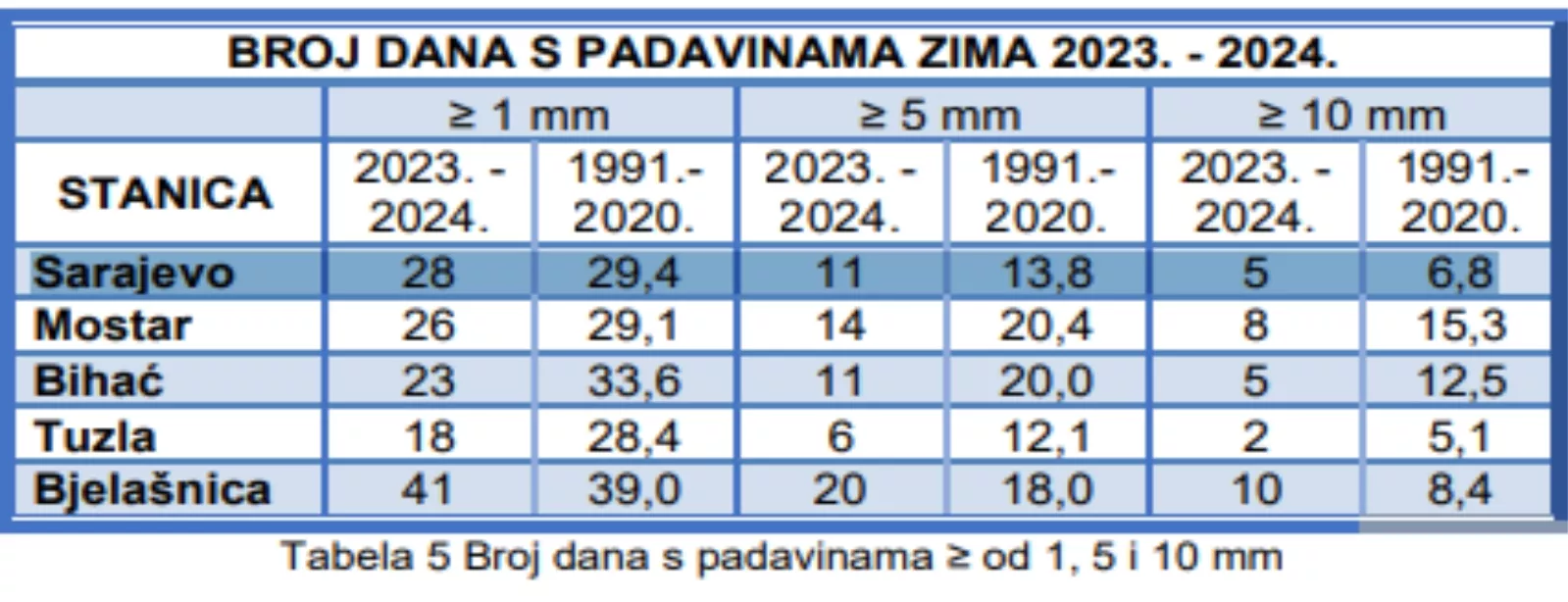 Iz priložene tabele može se vidjeti da su male, srednje i velike padavine ispod prosjeka padavina unazad 30 godina.