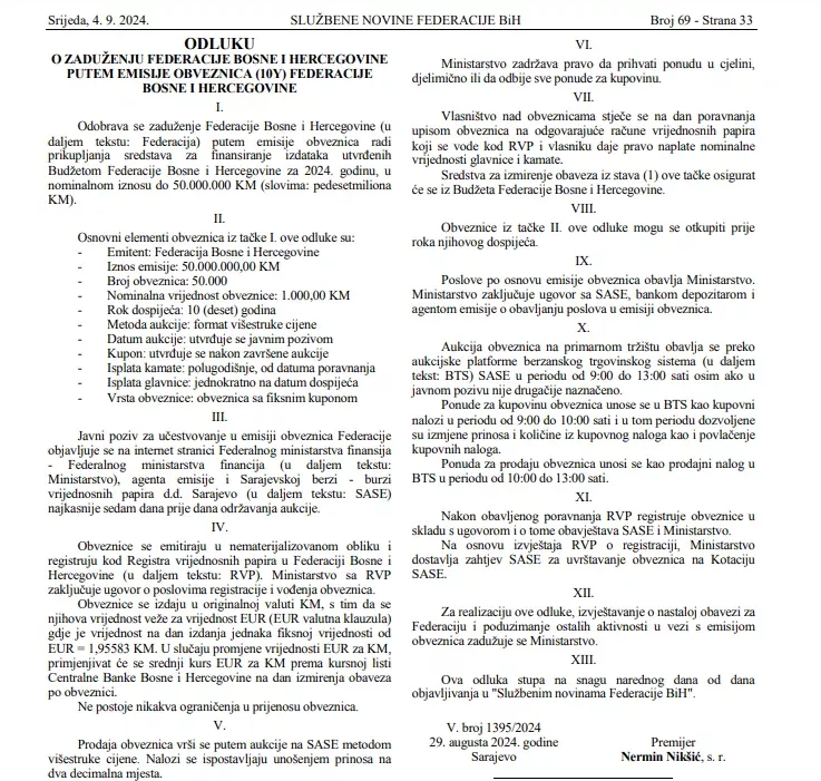 Kako je navedeno u Službenom listu FBiH, odluka o zaduženju donesena je radi prikupljanja sredstava za finansiranja izdataka utvđenih budžetom FBiH za 2024. godinu.