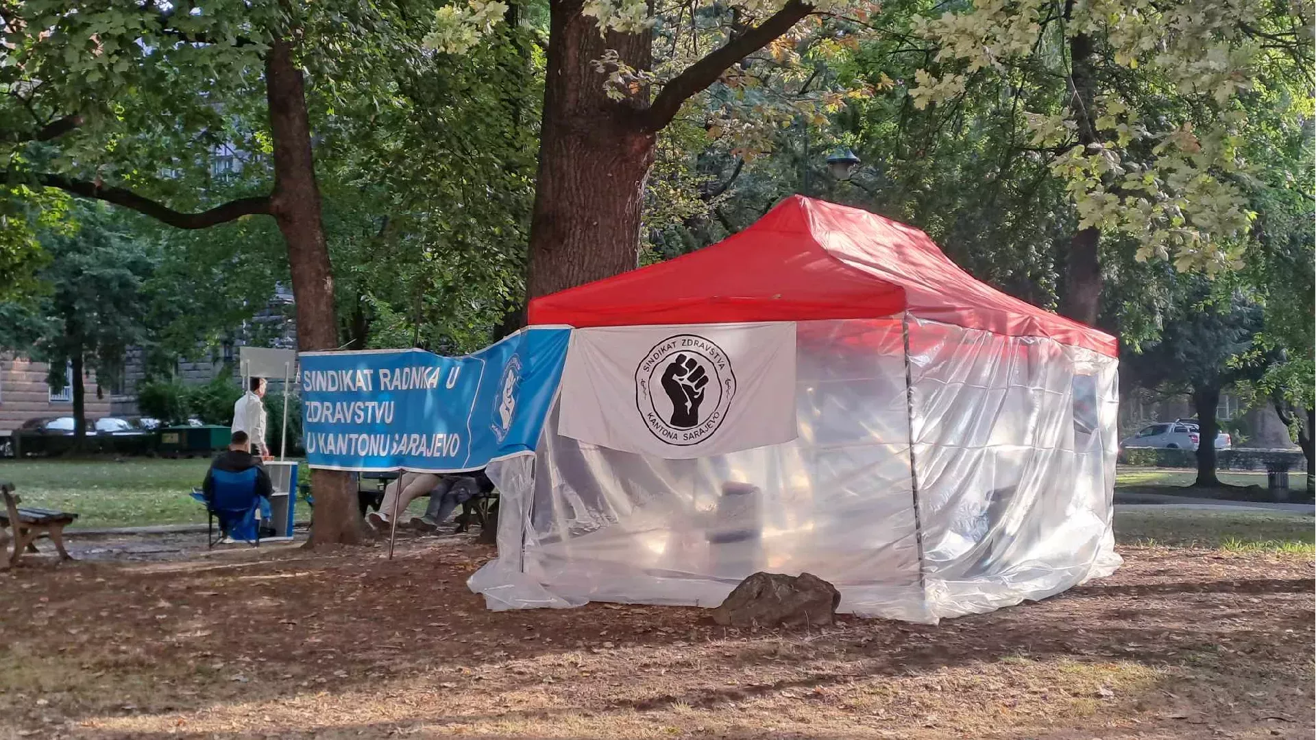 (Patria) - Sindikat radnika u zdravstvu Kantona Sarajevo i danas je u parku pred Vladom KS gdje su jučer izašli na proteste i postavili šator do ispunjenja zahtjeva za povećanje satnice rada sa 3,07 na 3,70 KM.