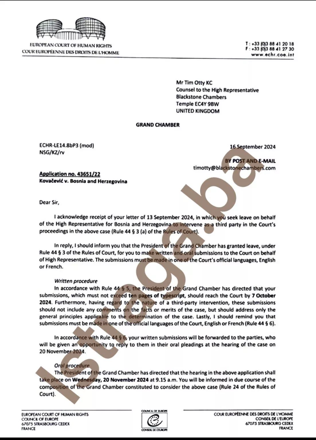 "Potvrđujem primitak vašeg pisma od 13. septembra 2024., u kojem tražite dopuštenje u ime visokog predstavnika za Bosnu i Hercegovinu da intervenirate kao treća strana u postupku pred Sudom u gorenavedenom predmetu (Pravilo 44. stavak 3. (a) Poslovnik Suda).