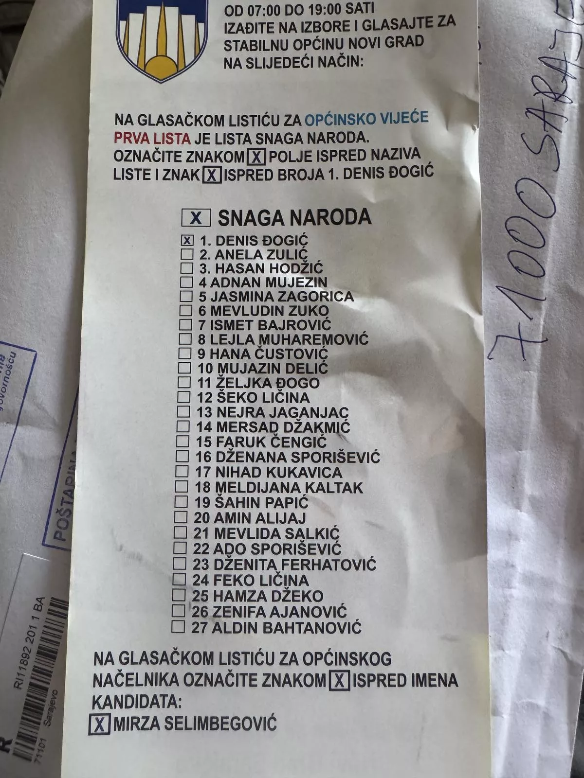 Odnosno, da svoj glas daju za Mirzu Selimbegovića, kandidata Naroda i Pravde za načelnika Općine Novi Grad Sarajevo, te Denisa Đogića nosioca liste političke partije Snaga naroda za Općinsko vijeće Novi Grad Sarajevo. Uz upute kako glasati, ovaj materijal zloupotrebljava i službeni simbol Općine Novi Grad Sarajevo što je nedopustiva praksa i manipulacija građanima.