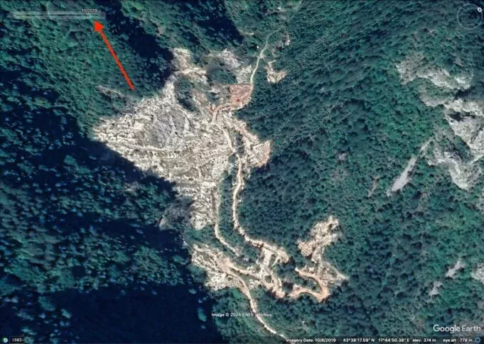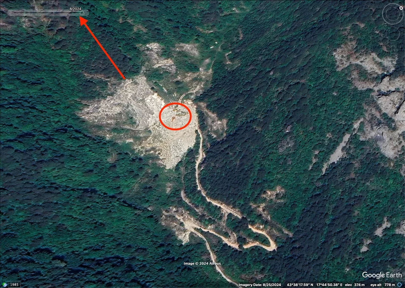 Na ovoj fotografiji već se vidi da je dio kamenoloma ponovo aktivan. Mašine kojih nije bilo 2019. godine ponovo su tu. Pratite strjelicu unutar kruga i uočit ćete jednu od mašina koje su radile na kamenolomu.