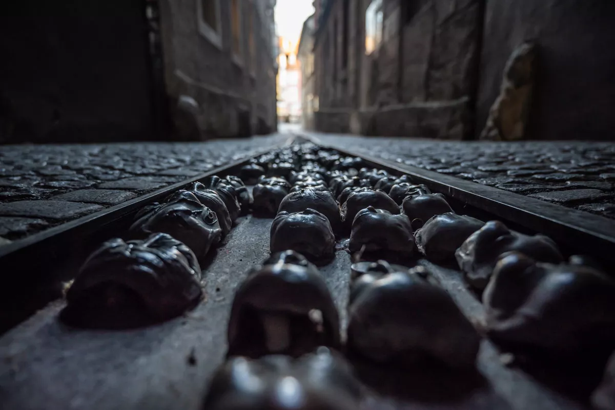 Bronzano remek-djelo izgleda poput rijeke neobičnih lica koja teku jarkom po sredini te zanimljive ulice.