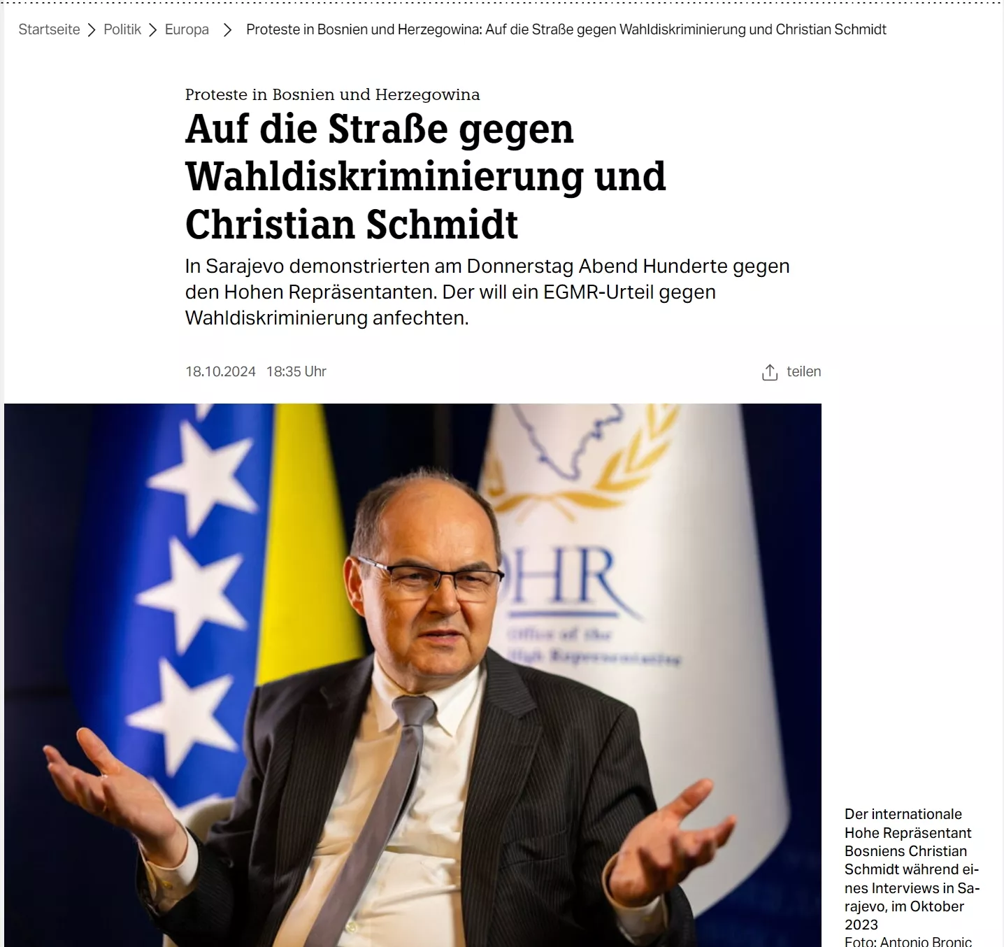 U centru protesta u Sarajevu je Schmidtov stav u ovom slučaju. Prema demonstrantima, Schmidt je stao na stranu nacionalista pokušavajući se uz pomoć skupih advokata umiješati u presudu EHCR-a.
