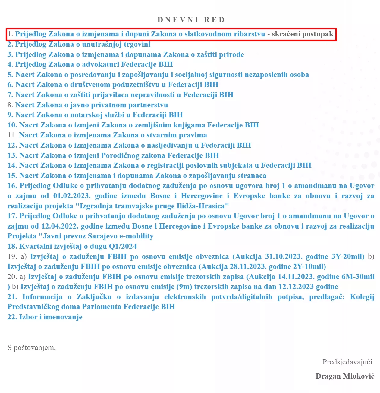 Dnevni red sjednice, slatkovodno ribarstvo na mjestu broj 1