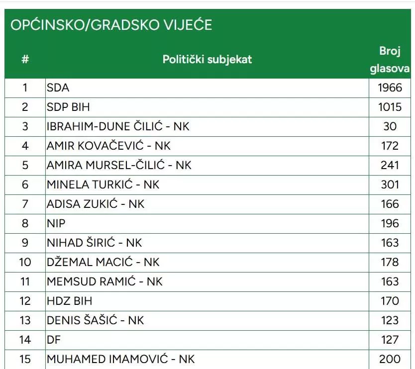 (Patria) - Nakon 90 posto prebrojanih listića za Općinsko vijeće Jablanice, SDA je u ubjedljivom vodstvu sa skoro duplo više glasova od SDP-a.
